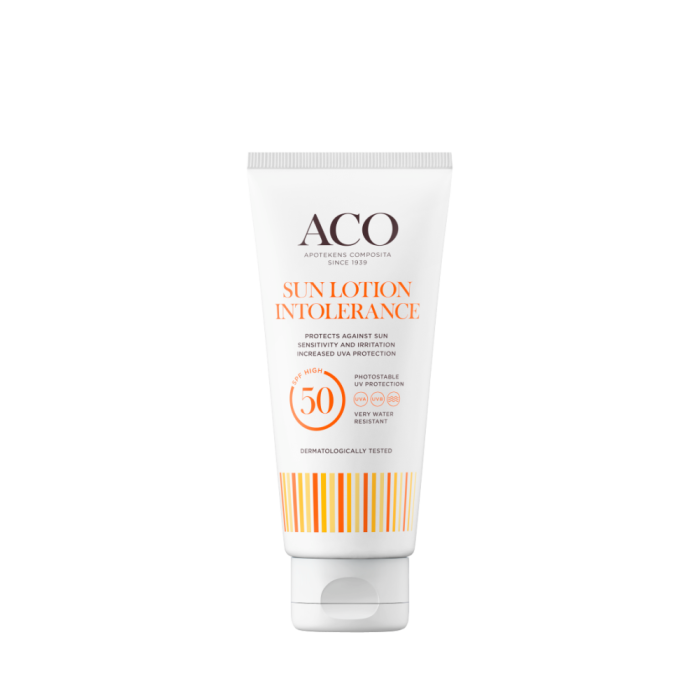 ACO Sun Intolerance Lotion SPF50 är en parfymfri och återfuktande solskyddscreme för solkänslig hud.