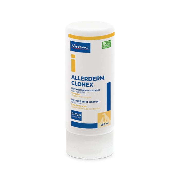 Desinfioiva klooriheksidiini shampoo koirille ja kissoille. Klooriheksidiini ja kitosaani auttavat hillitsemään mikrobien liikakasvua iholla. Allerderm Clohex dermatologinen shampoo puhdistaa perusteellisesti ärsyttämättä ja kuivattamatta ihoa. Kätevä, yhdellä kädellä avattava pakkaus ja shampoon hallitsemattoman valumisen estävä venttiili korkissa. Ympäristöystävällinen pullo, valmistettu 100 % kierrätysmateriaaleista.