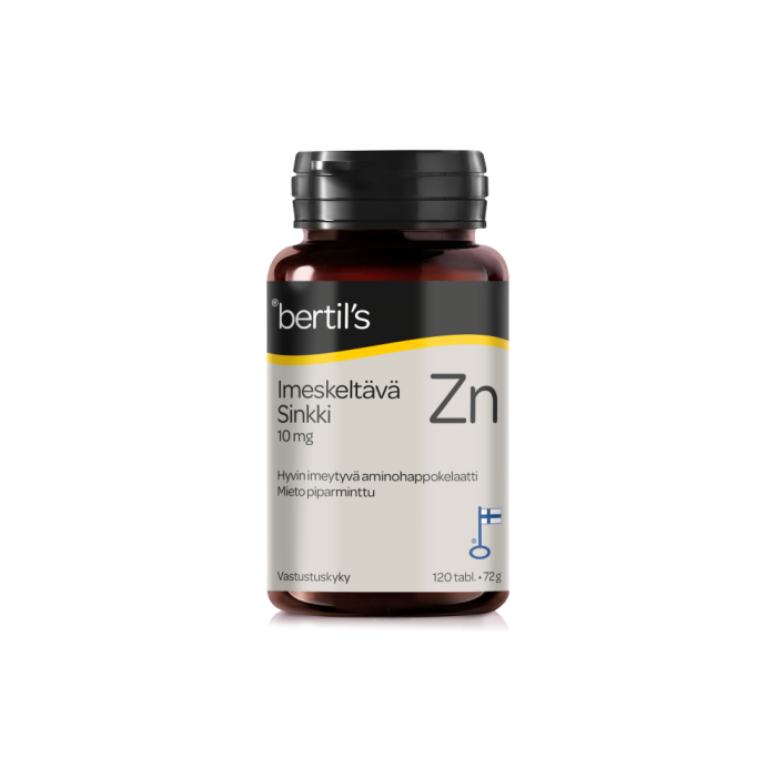 bertil’s imeskeltävä Sinkki sisältää aminohappokelatoitua sinkkiä, joka on sinkin erinomaisesti imeytyvä ja vatsaystävällinen muoto. Imeskeltävässä muodossa se sopii erinomaisesti myös akuuttiin tarpeeseen. Vastustuskyvyn ylläpitämisen lisäksi sinkki on tärkeä elimistön kaikille rakennus- ja uudistumistoiminnoille. Sen vaikutukset näkyvät parhaiten nopeasti uudistuvien kudosten kuten ihon, hiusten ja kynsien hyvinvoinnissa.