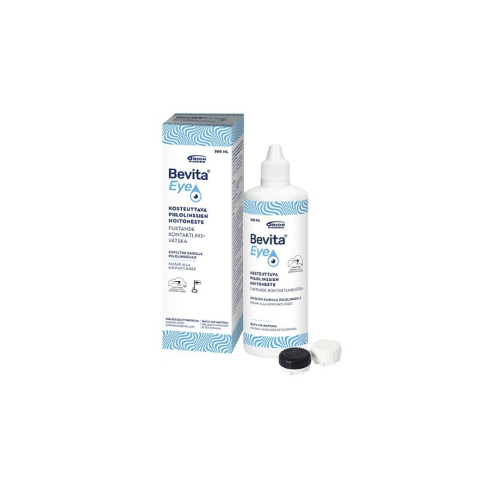 Bevita Eye Fuktande Kontaktlinslösning har utvecklats för rengöring, desinfektion, förvaring, sköljning och fuktning av alla kontaktlinser, särskilt silikonhydrogel-linser. Finns i förpackningar om 100 ml och 360 ml. Inkluderar förvaringslåda.