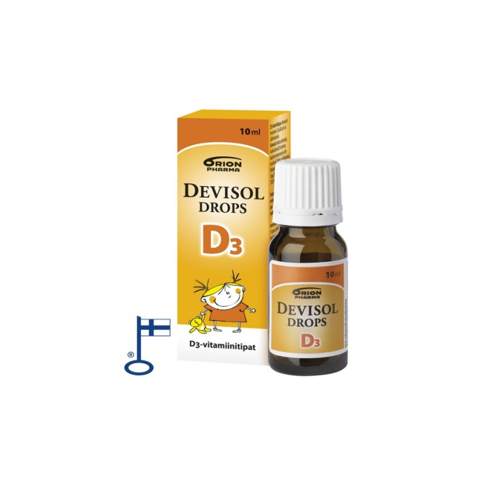 DeviSol Drops on D3-vitamiinia sisältävä öljypohjainen tippavalmiste, joka soveltuu päivittäisen D-vitamiinin saannin varmistamiseen vauvaiästä lähtien. Helppo annostella lusikalla tai sekoittaa ruokaan tai juomaan. Täysin makuaineettomat DeviSol-tipat voi sekoittaa joko kuumaan tai kylmään ruokaan tai juomaan. Ei sisällä säilöntä-, väri- tai aromiaineita. Säilyy huoneenlämmössä myös avaamisen jälkeen. Suositeltu päiväannos on 1-5 tippaa eli 2-10 mikrogrammaa. Suomessa valmistettu Avainlippu-tuote.