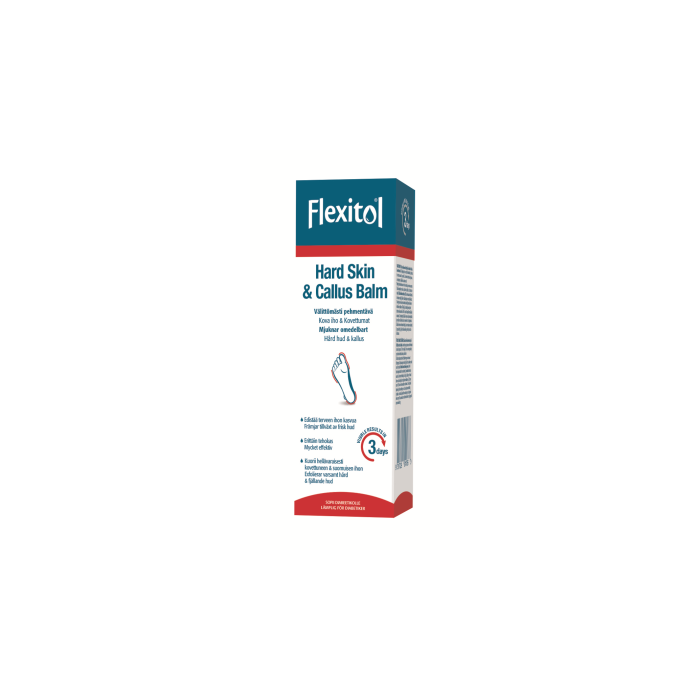 FLEXITOL HARD SKIN & CALLUS BALM voide on kehitetty pehmentämään kovettumia. Erittäin tehokas voide sisältää 22 % ureaa ja yhdistelmän hedelmähappoja, jotka imeytyvät syvälle ihoon. Voide kuorii kovaa ihoa ja kovettumia, aiheuttamatta haittaa kovettumien alla olevalle normaalille iholle. Tuotteen ainutlaatuinen kosteussuojajärjestelmä sitoo kosteuttavia ainesosia iholle ja edistää terveen ihon kasvua.