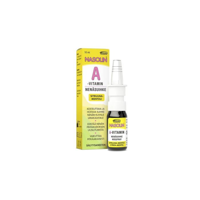 Nasolin A-vitamin nenäsuihkeet ovat kosteuttavia ja hoitavia nenäsuihkeita, jotka sisältävät seesamiöljyä ja A-vitamiinia. Ne kosteuttavat ja hoitavat kuivia nenän limakalvoja ja auttavat niitä pysymään terveinä. Säilöntäaineettomia. Kehitetty ja valmistettu Suomessa. Nasolin A-vitamin nenäsuihkeet ovat CE-merkittyjä lääkinnällisiä laitteita, CE0537, valmistaja Pharmia Oy.