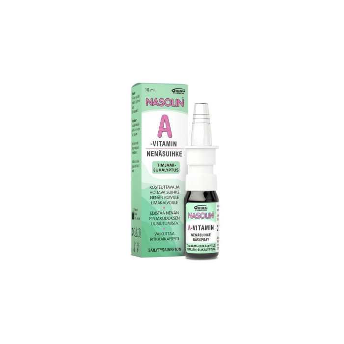 Nasolin A-vitamin nenäsuihkeet ovat kosteuttavia ja hoitavia nenäsuihkeita, jotka sisältävät seesamiöljyä ja A-vitamiinia. Ne kosteuttavat ja hoitavat kuivia nenän limakalvoja ja auttavat niitä pysymään terveinä. Säilöntäaineettomia. Kehitetty ja valmistettu Suomessa. Nasolin A-vitamin nenäsuihkeet ovat CE-merkittyjä lääkinnällisiä laitteita, CE0537, valmistaja Pharmia Oy.